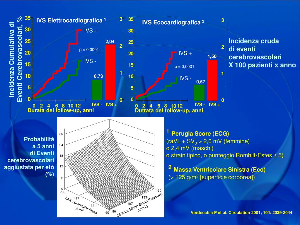 3 5 IVS Elettrocardiografica 1 3 3 5 3 IVS Ecocardiografica 2 IVS + 3 0 3 0 Incidenza cruda di eventi cerebrovascolari X 100 pazienti x anno 2,04 2 5 2 5 2 2 p = 0,0001 IVS + 2 0 Incidenza Cumulativa di Eventi Cerebrovascolari, % 2 0 1,50 IVS - 1 5 1 5 p = 0,0001 1 1 0,73 1 0 1 0 IVS - 0,57 5 5 0 0 0 0 IVS - IVS + IVS - IVS + 0 10 12 2 4 6 8 2 4 6 8 0 12 10 Durata del follow-up, anni Dutrata del follow-up, anni 1Perugia Score (ECG) (raVL + SV3 > 2,0 mV (femmine) o 2,4 mV (maschi) o strain tipico, o punteggio Romhilt-Estes 5) Probabilità a 5 anni di Eventi cerebrovascolari aggiustata per etò (%) 2Massa Ventricolare Sinistra (Eco) (> 125 g/m2 [superficie corporea]) Verdecchia P et al. Circulation 2001; 104: 2039-2044