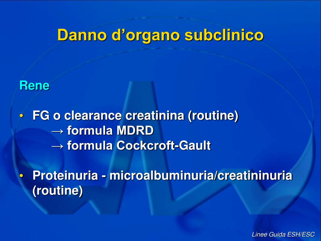 Danno d’organo subclinico • Rene • FG o clearance creatinina (routine) → formula MDRD → formula Cockcroft-Gault • Proteinuria - microalbuminuria/creatininuria (routine) Linee Guida ESH/ESC