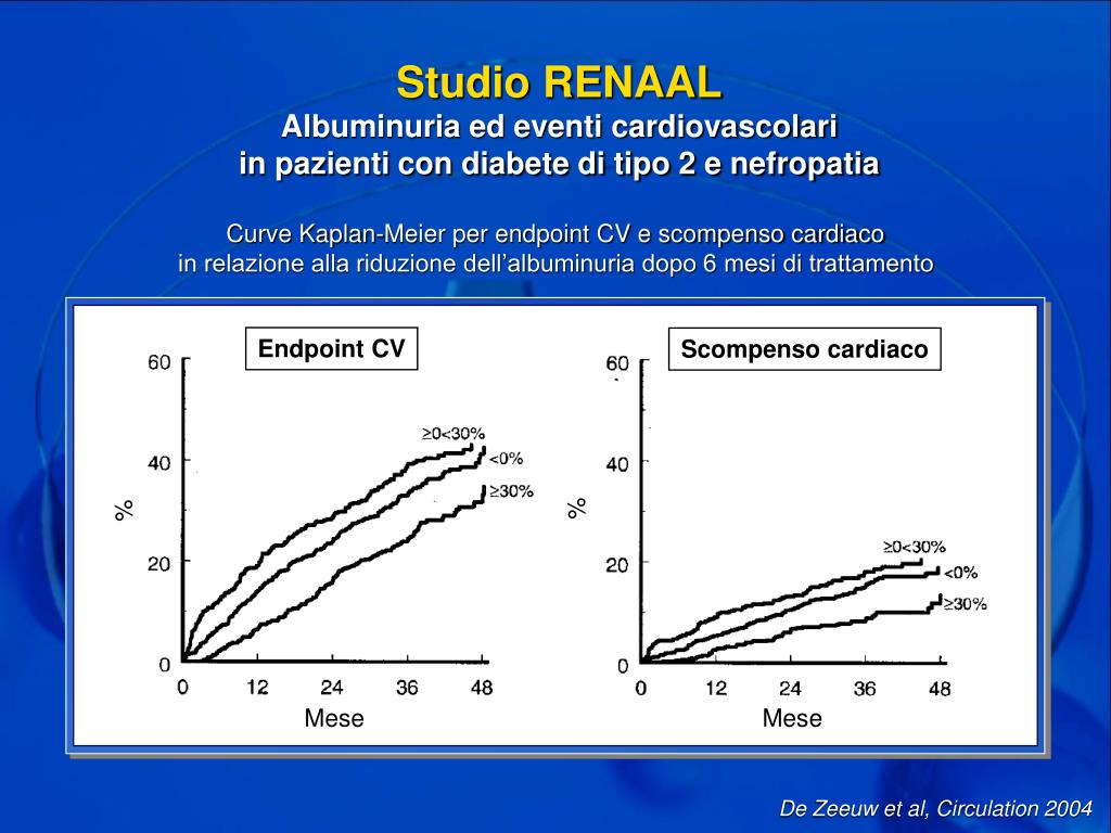 Endpoint CV Scompenso cardiaco % % Mese Mese Studio RENAALAlbuminuria ed eventi cardiovascolari in pazienti con diabete di tipo 2 e nefropatia Curve Kaplan-Meier per endpoint CV e scompenso cardiaco in relazione alla riduzione dell’albuminuria dopo 6 mesi di trattamento De Zeeuw et al, Circulation 2004