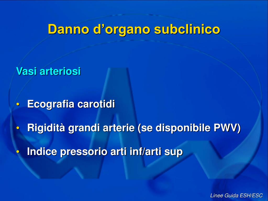 Danno d’organo subclinico • Vasi arteriosi • Ecografia carotidi • Rigidità grandi arterie (se disponibile PWV) • Indice pressorio arti inf/arti sup Linee Guida ESH/ESC