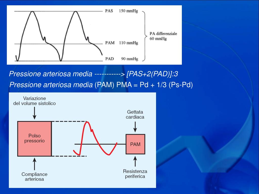 Pressione arteriosa media -----------> [PAS+2(PAD)]:3 Pressione arteriosa media (PAM) PMA = Pd + 1/3 (Ps-Pd)