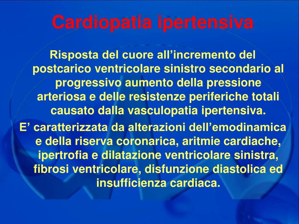 Cardiopatia ipertensiva Risposta del cuore all’incremento del postcarico ventricolare sinistro secondario al progressivo aumento della pressione arteriosa e delle resistenze periferiche totali causato dalla vasculopatia ipertensiva. E’ caratterizzata da alterazioni dell’emodinamica e della riserva coronarica, aritmie cardiache, ipertrofia e dilatazione ventricolare sinistra, fibrosi ventricolare, disfunzione diastolica ed insufficienza cardiaca.
