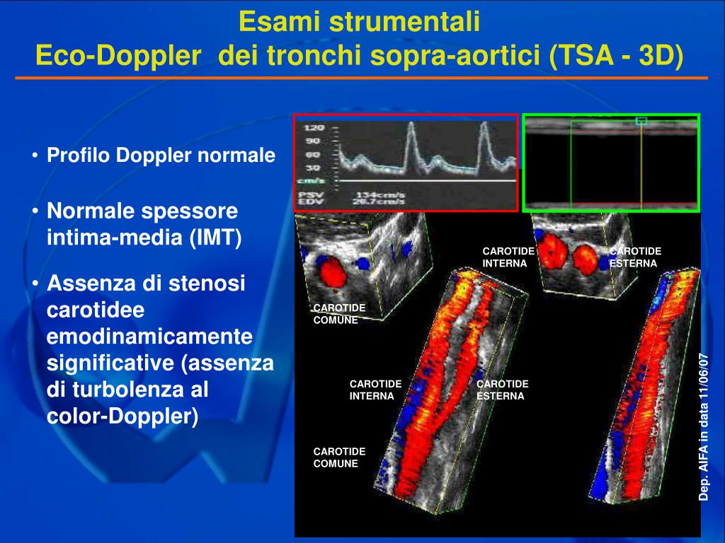 Esami strumentali Eco-Doppler dei tronchi sopra-aortici (TSA - 3D) • Profilo Doppler normale • Normale spessore intima-media (IMT) CAROTIDE INTERNA CAROTIDE ESTERNA • Assenza di stenosi carotidee emodinamicamente significative (assenza di turbolenza al color-Doppler) CAROTIDE COMUNE CAROTIDE INTERNA CAROTIDE ESTERNA Dep. AIFA in data 11/06/07 CAROTIDE COMUNE
