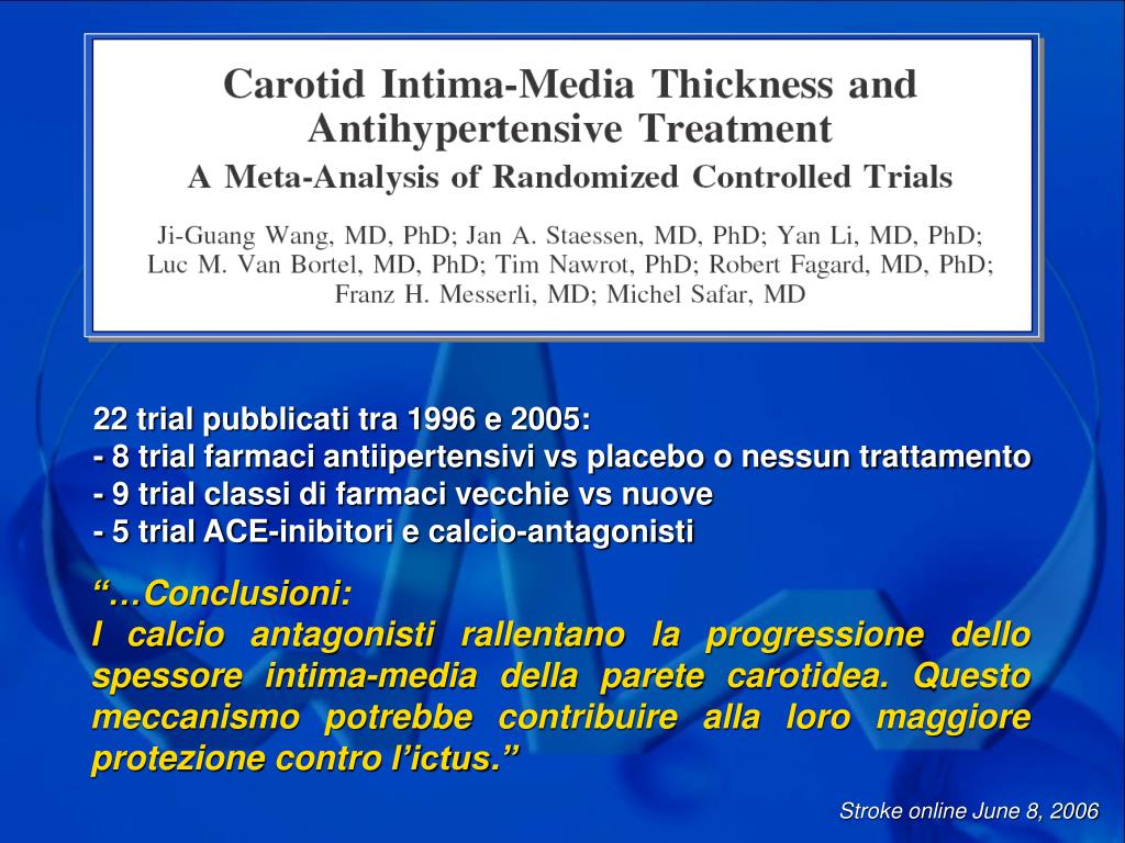 22 trial pubblicati tra 1996 e 2005: - 8 trial farmaci antiipertensivi vs placebo o nessun trattamento- 9 trial classi di farmaci vecchie vs nuove - 5 trial ACE-inibitori e calcio-antagonisti “…Conclusioni: I calcio antagonisti rallentano la progressione dello spessore intima-media della parete carotidea. Questo meccanismo potrebbe contribuire alla loro maggiore protezione contro l’ictus.” Stroke online June 8, 2006