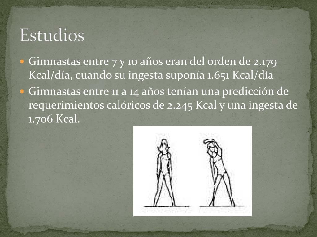 Estudios • Gimnastas entre 7 y 10 años eran del orden de 2.179 Kcal/día, cuando su ingesta suponía 1.651 Kcal/día • Gimnastas entre 11 a 14 años tenían una predicción de requerimientos calóricos de 2.245 Kcal y una ingesta de 1.706 Kcal.