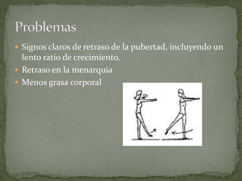 Problemas • Signos claros de retraso de la pubertad, incluyendo un lento ratio de crecimiento. • Retraso en la menarquia • Menos grasa corporal