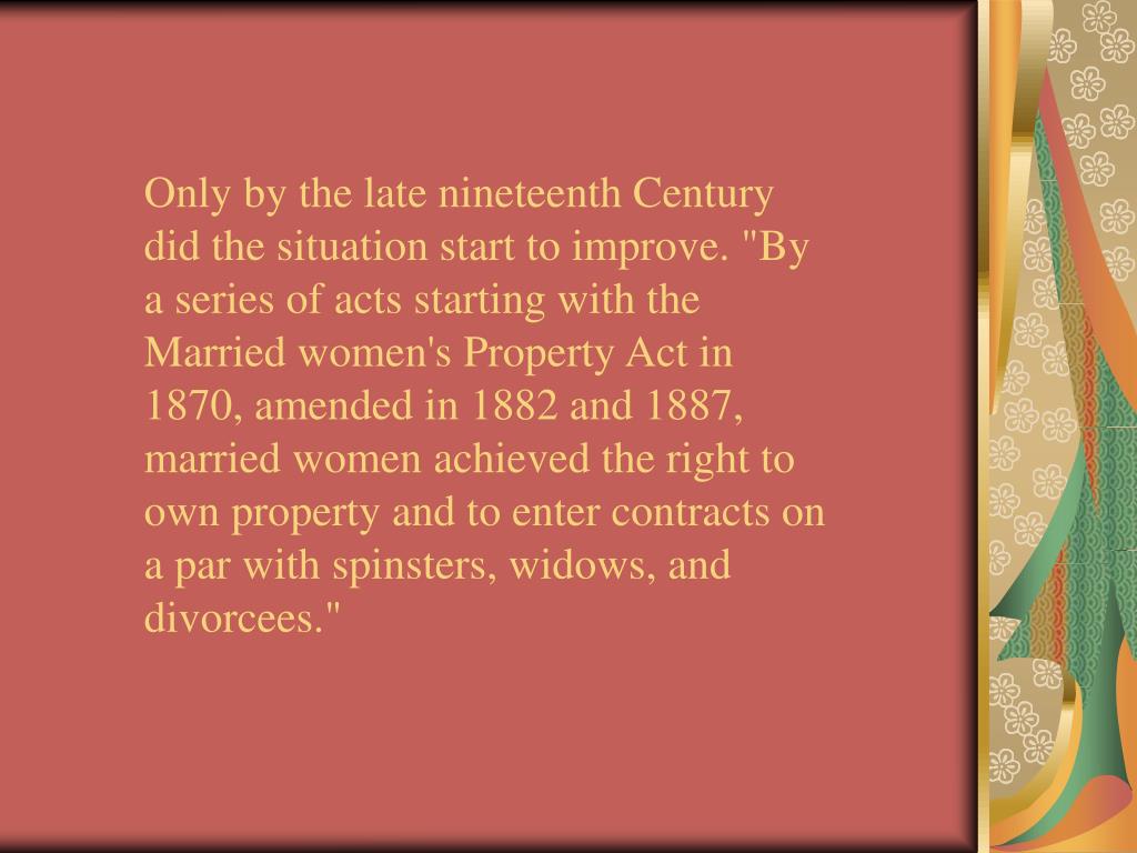 Only by the late nineteenth Century did the situation start to improve. "By a series of acts starting with the Married women's Property Act in 1870, amended in 1882 and 1887, married women achieved the right to own property and to enter contracts on a par with spinsters, widows, and divorcees."