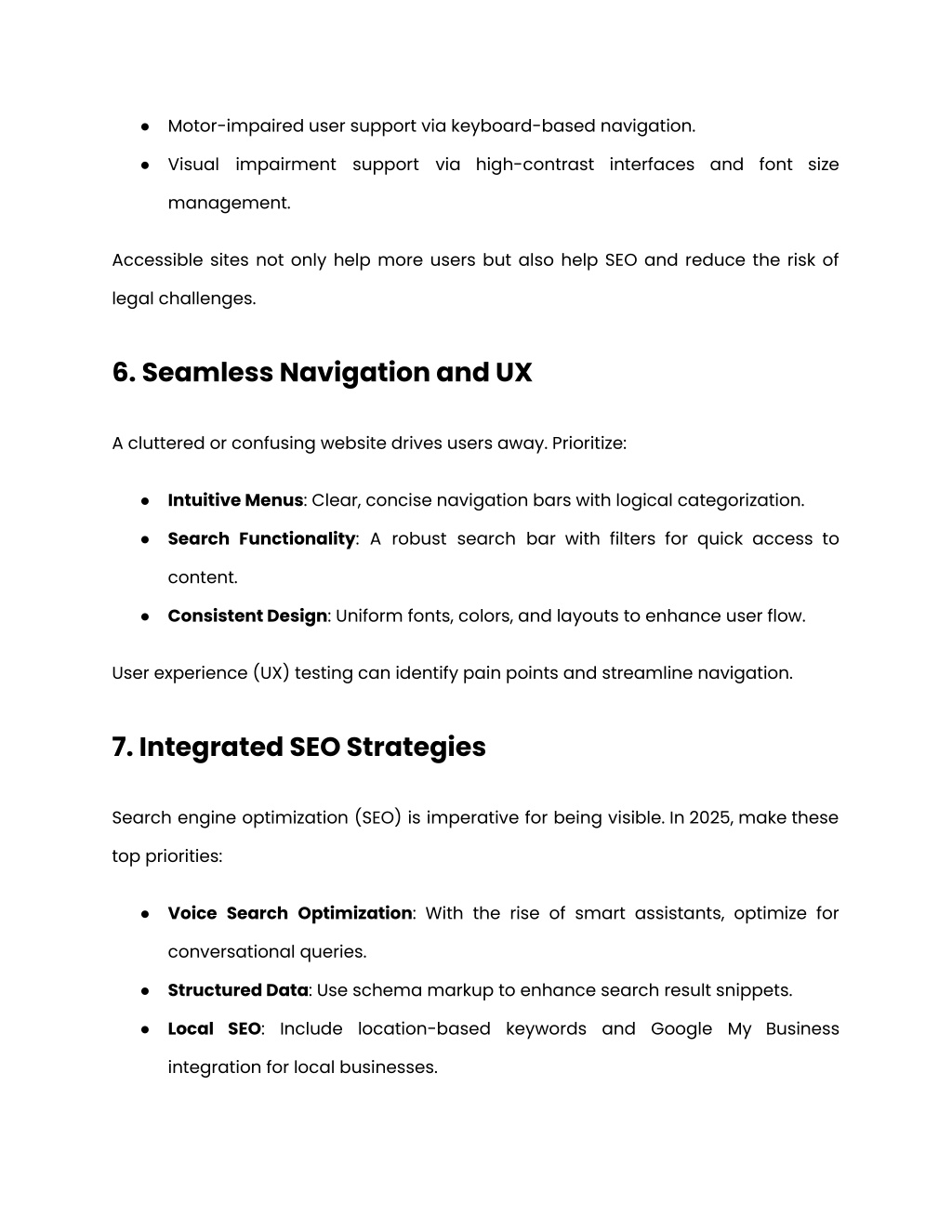 ● Motor-impaired user support via keyboard-based navigation. ● Visual impairment support via high-contrast interfaces and font size management. Accessible sites not only help more users but also help SEO and reduce the risk of legal challenges. 6. Seamless Navigation and UX A cluttered or confusing website drives users away. Prioritize: ● Intuitive Menus: Clear, concise navigation bars with logical categorization. ● Search Functionality: A robust search bar with filters for quick access to content. ● Consistent Design: Uniform fonts, colors, and layouts to enhance user flow. User experience (UX) testing can identify pain points and streamline navigation. 7. Integrated SEO Strategies Search engine optimization (SEO) is imperative for being visible. In 2025, make these top priorities: ● Voice Search Optimization: With the rise of smart assistants, optimize for conversational queries. ● Structured Data: Use schema markup to enhance search result snippets. ● Local SEO: Include location-based keywords and Google My Business integration for local businesses.