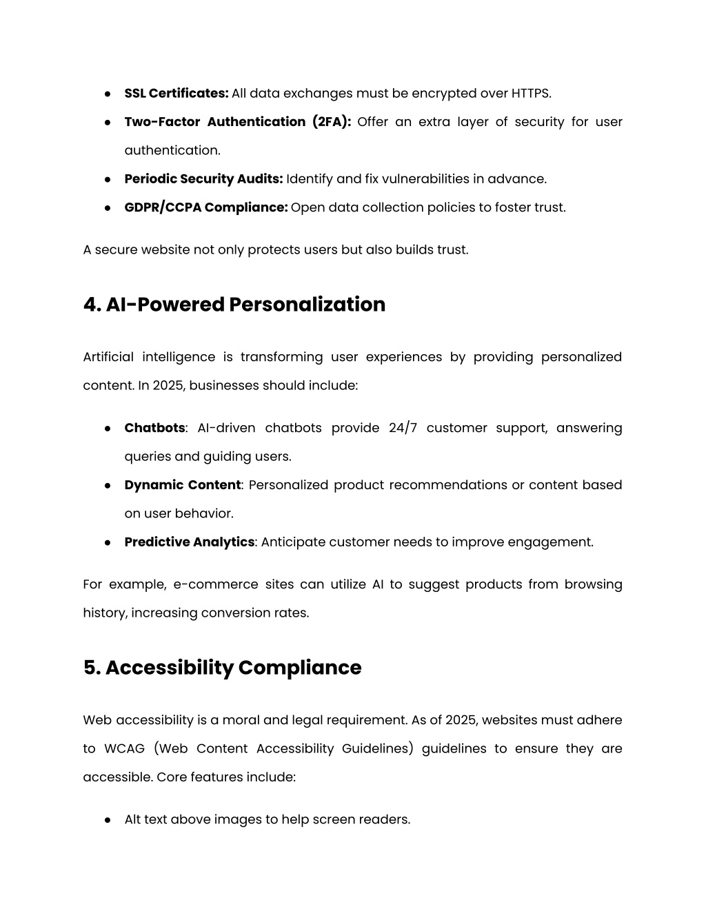 ● SSL Certificates: All data exchanges must be encrypted over HTTPS. ● Two-Factor Authentication (2FA): Offer an extra layer of security for user authentication. ● Periodic Security Audits: Identify and fix vulnerabilities in advance. ● GDPR/CCPA Compliance: Open data collection policies to foster trust. A secure website not only protects users but also builds trust. 4. AI-Powered Personalization Artificial intelligence is transforming user experiences by providing personalized content. In 2025, businesses should include: ● Chatbots: AI-driven chatbots provide 24/7 customer support, answering queries and guiding users. ● Dynamic Content: Personalized product recommendations or content based on user behavior. ● Predictive Analytics: Anticipate customer needs to improve engagement. For example, e-commerce sites can utilize AI to suggest products from browsing history, increasing conversion rates. 5. Accessibility Compliance Web accessibility is a moral and legal requirement. As of 2025, websites must adhere to WCAG (Web Content Accessibility Guidelines) guidelines to ensure they are accessible. Core features include: ● Alt text above images to help screen readers.