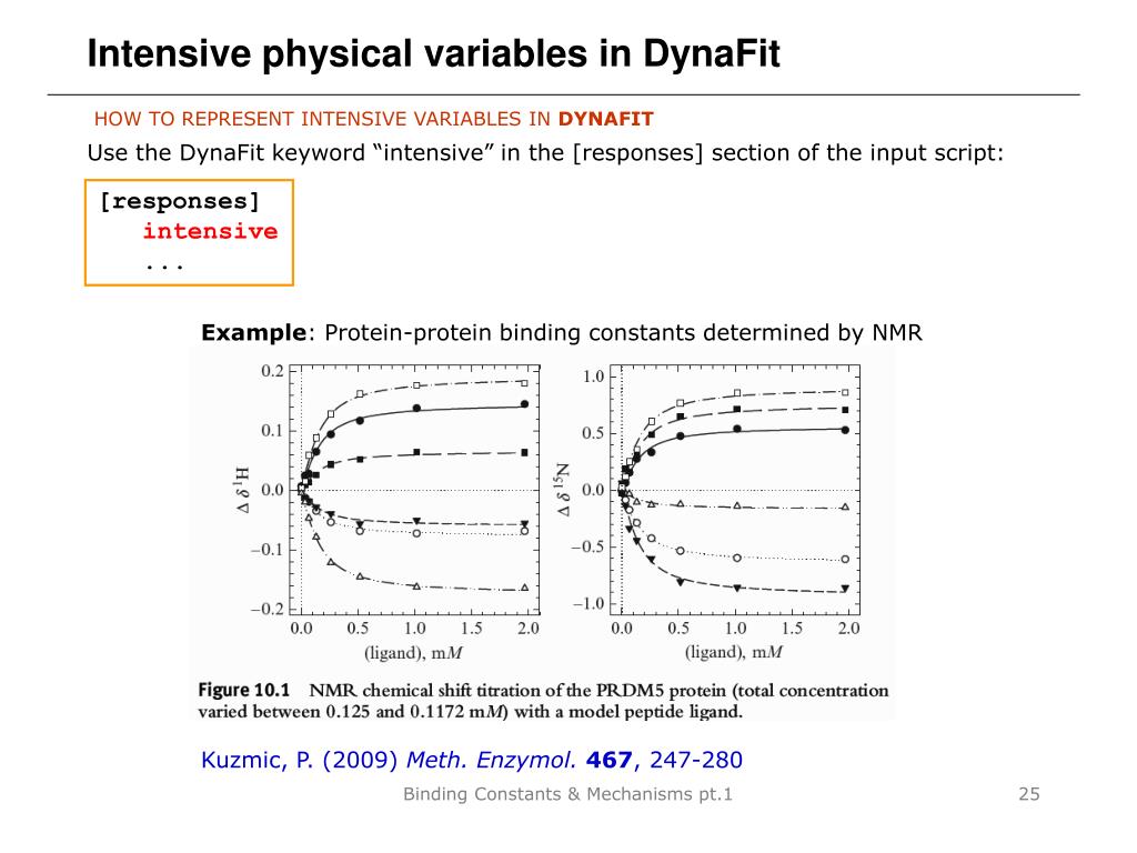 Intensive physical variables in DynaFit HOW TO REPRESENT INTENSIVE VARIABLES IN DYNAFIT Use the DynaFit keyword “intensive” in the [responses] section of the input script: [responses] intensive ... Example: Protein-protein binding constants determined by NMR Kuzmic, P. (2009) Meth. Enzymol.467, 247-280 Binding Constants & Mechanisms pt.1