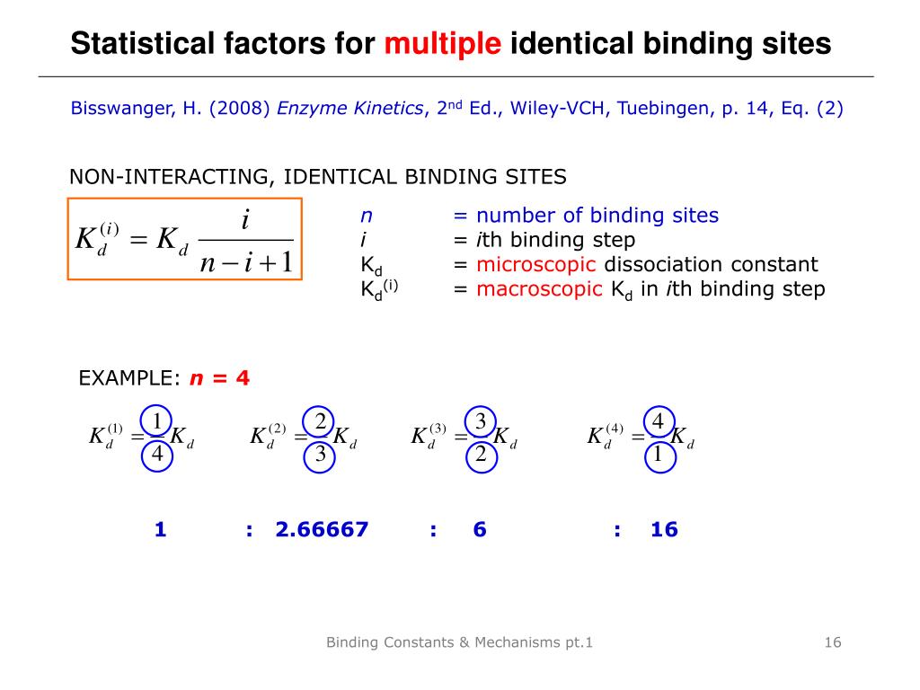 EXAMPLE: n = 4 Statistical factors for multiple identical binding sites Bisswanger, H. (2008) Enzyme Kinetics, 2nd Ed., Wiley-VCH, Tuebingen, p. 14, Eq. (2) NON-INTERACTING, IDENTICAL BINDING SITES n = number of binding sites i = ith binding step Kd = microscopic dissociation constant Kd(i) = macroscopic Kd in ith binding step 1 : 2.66667 : 6 : 16 Binding Constants & Mechanisms pt.1