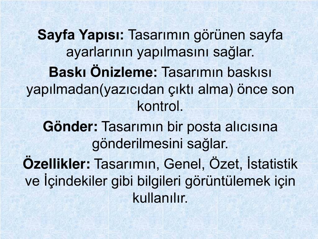 Sayfa Yapısı: Tasarımın görünen sayfa ayarlarının yapılmasını sağlar. Baskı Önizleme: Tasarımın baskısı yapılmadan(yazıcıdan çıktı alma) önce son kontrol. Gönder: Tasarımın bir posta alıcısına gönderilmesini sağlar. Özellikler: Tasarımın, Genel, Özet, İstatistik ve İçindekiler gibi bilgileri görüntülemek için kullanılır.