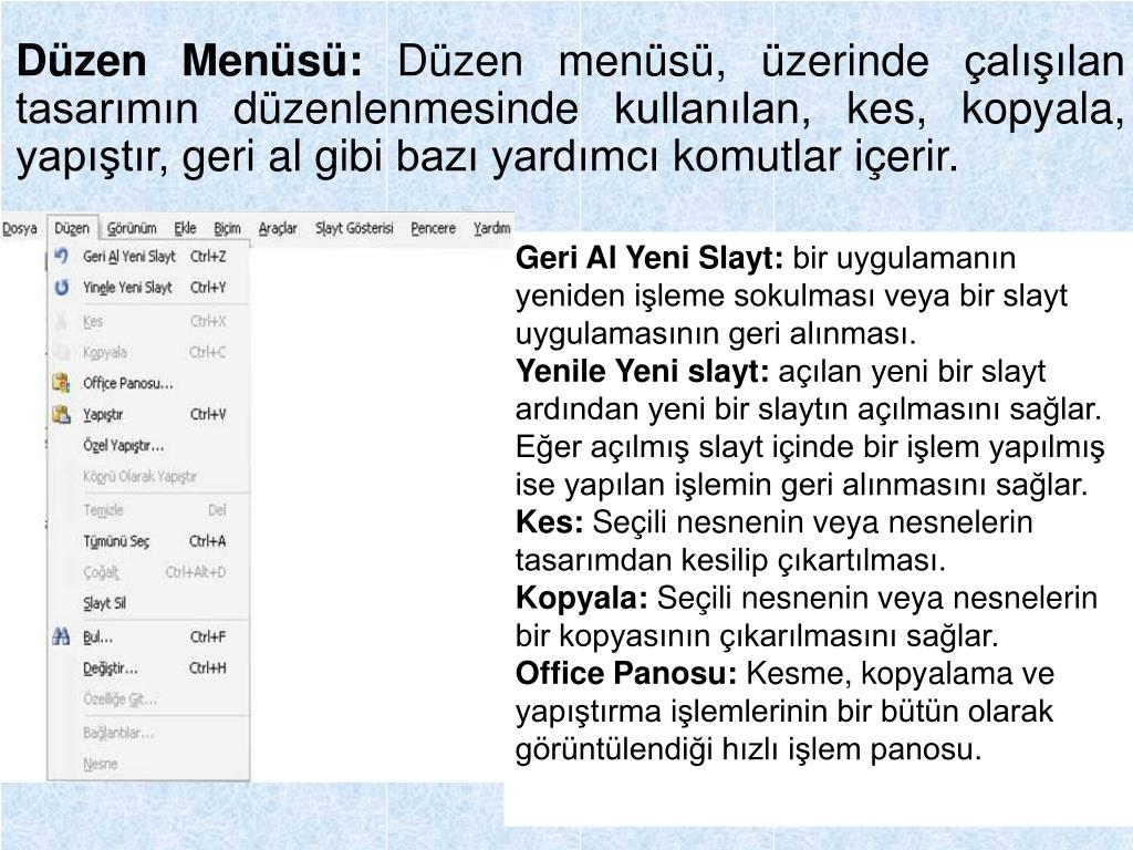 Geri Al Yeni Slayt: bir uygulamanın yeniden işleme sokulması veya bir slayt uygulamasının geri alınması. Yenile Yeni slayt: açılan yeni bir slayt ardından yeni bir slaytın açılmasını sağlar. Eğer açılmış slayt içinde bir işlem yapılmış ise yapılan işlemin geri alınmasını sağlar. Kes: Seçili nesnenin veya nesnelerin tasarımdan kesilip çıkartılması. Kopyala: Seçili nesnenin veya nesnelerin bir kopyasının çıkarılmasını sağlar. Office Panosu: Kesme, kopyalama ve yapıştırma işlemlerinin bir bütün olarak görüntülendiği hızlı işlem panosu. Düzen Menüsü: Düzen menüsü, üzerinde çalışılan tasarımın düzenlenmesinde kullanılan, kes, kopyala, yapıştır, geri al gibi bazı yardımcı komutlar içerir.