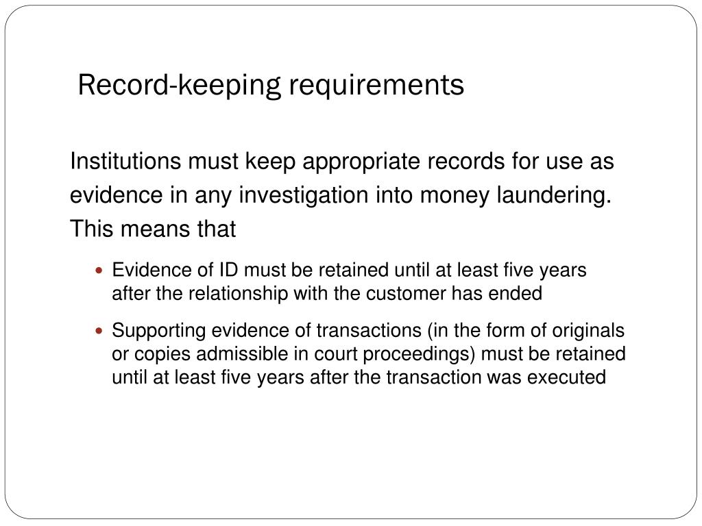 Record-keeping requirements Institutions must keep appropriate records for use as evidence in any investigation into money laundering. This means that • Evidence of ID must be retained until at least five years after the relationship with the customer has ended • Supporting evidence of transactions (in the form of originals or copies admissible in court proceedings) must be retained until at least five years after the transaction was executed