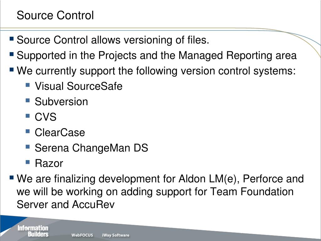 Source Control • Source Control allows versioning of files. • Supported in the Projects and the Managed Reporting area • We currently support the following version control systems: • Visual SourceSafe • Subversion • CVS • ClearCase • Serena ChangeMan DS • Razor • We are finalizing development for Aldon LM(e), Perforce and we will be working on adding support for Team Foundation Server and AccuRev