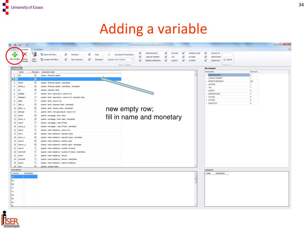 Variable Administration List of all variables existing in all countries in alphabetical order name Set vbl to monetary or non-monetary automatic label Description of variable for countries where it is used