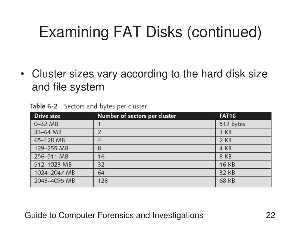 Examining FAT Disks (continued) • Cluster sizes vary according to the hard disk size and file system Guide to Computer Forensics and Investigations