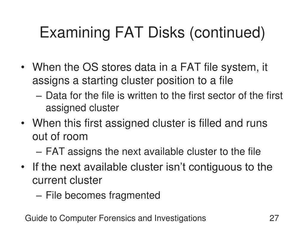 Examining FAT Disks (continued) • When you run out of room for an allocated cluster • OS allocates another cluster for your file, which creates more slack space on the disk • As files grow and require more disk space, assigned clusters are chained together • The chain can be broken or fragmented Guide to Computer Forensics and Investigations