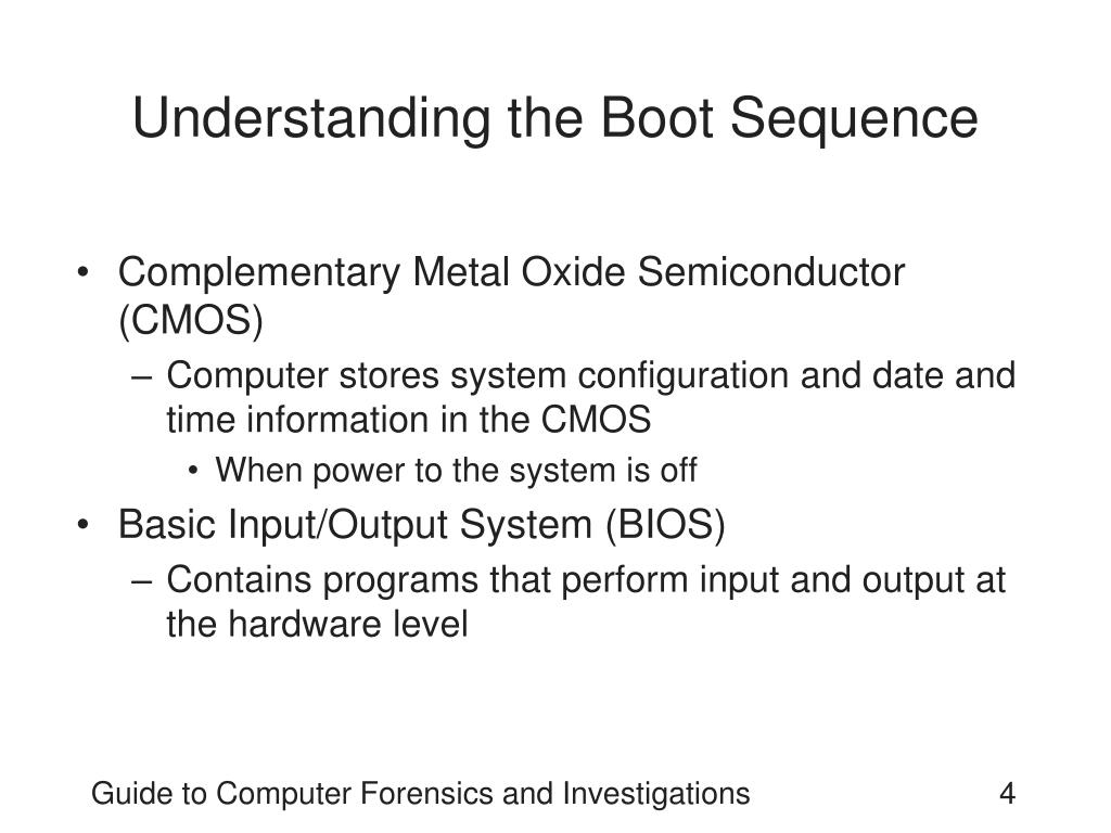 Understanding the Boot Sequence • Complementary Metal Oxide Semiconductor (CMOS) • Computer stores system configuration and date and time information in the CMOS • When power to the system is off • Basic Input/Output System (BIOS) • Contains programs that perform input and output at the hardware level Guide to Computer Forensics and Investigations