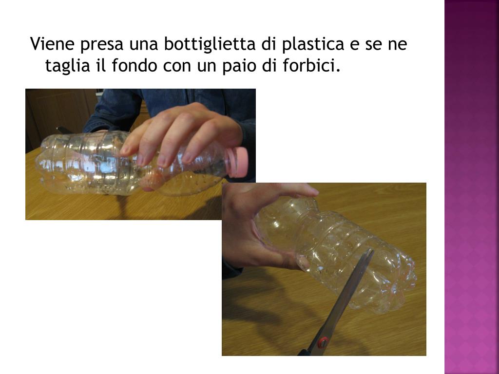 Viene presa una bottiglietta di plastica e se ne taglia il fondo con un paio di forbici.