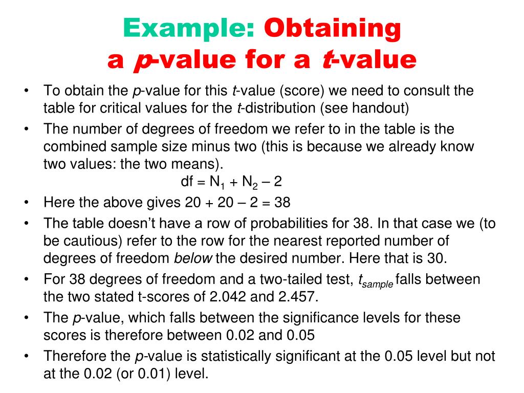 Example:Obtaining a p-value for a t-value • To obtain the p-value for this t-value (score) we need to consult the table for critical values for the t-distribution (see handout) • The number of degrees of freedom we refer to in the table is the combined sample size minus two (this is because we already know two values: the two means). df = N1 + N2 – 2 • Here the above gives 20 + 20 – 2 = 38 • The table doesn’t have a row of probabilities for 38. In that case we (to be cautious) refer to the row for the nearest reported number of degrees of freedom below the desired number. Here that is 30. • For 38 degrees of freedom and a two-tailed test, tsamplefalls between the two stated t-scores of 2.042 and 2.457. • The p-value, which falls between the significance levels for these scores is therefore between 0.02 and 0.05 • Therefore the p-value is statistically significant at the 0.05 level but not at the 0.02 (or 0.01) level.