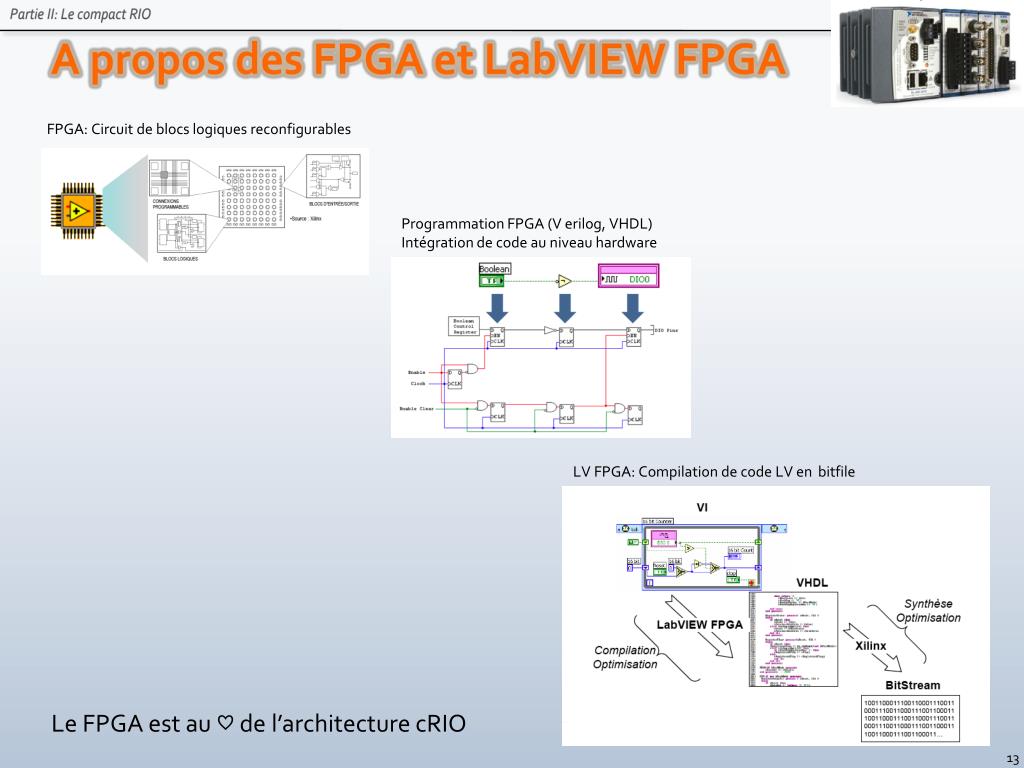 Partie II: Le compact RIO A propos des FPGA et LabVIEW FPGA FPGA: Circuit de blocs logiques reconfigurables Programmation FPGA (V erilog, VHDL) Intégration de code au niveau hardware LV FPGA: Compilation de code LV en bitfile Le FPGA est au ♡ de l’architecture cRIO 13