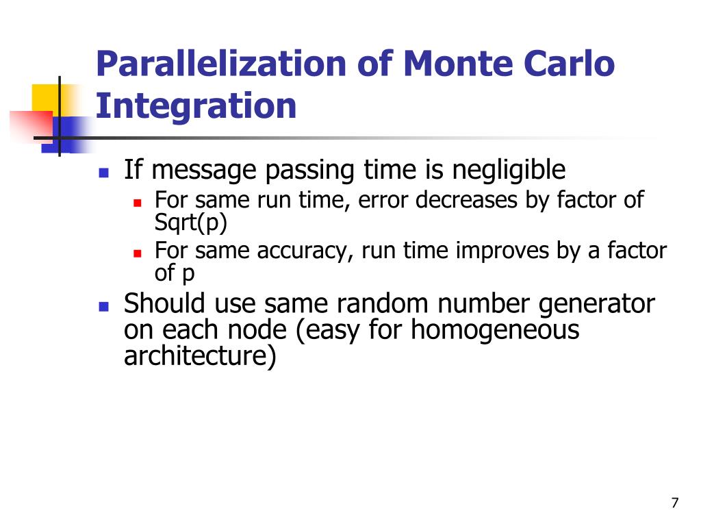 Parallelization of Monte Carlo Integration • If message passing time is negligible • For same run time, error decreases by factor of Sqrt(p) • For same accuracy, run time improves by a factor of p • Should use same random number generator on each node (easy for homogeneous architecture)