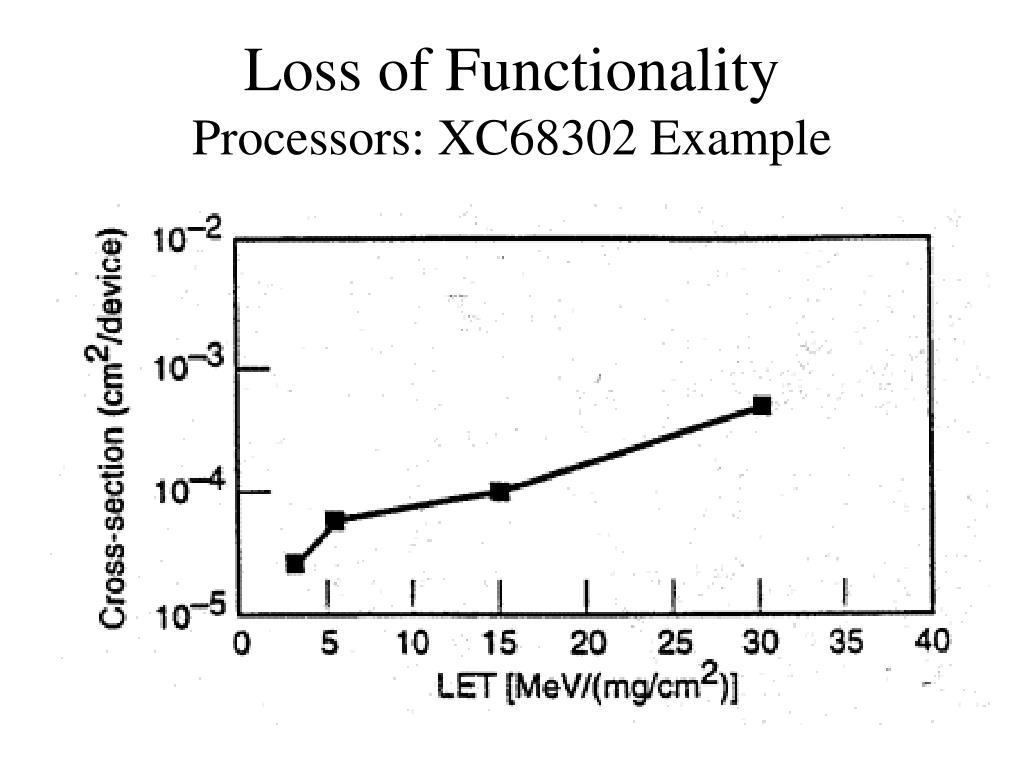 Loss of FunctionalityProcessors • Processor simply stopped functioning without showing any observable bit errors. • Noticed lockup in many microprocessors including MG80C186, MG80C286, and XC68302. • Sensitivity to lockup was essentially independent of the test programs. “Single Event Functional Interrupt (SEFI) Sensitivity in EEPROMs,” R. Koga, 1998 MAPLD International Conference, Greenbelt, MD.