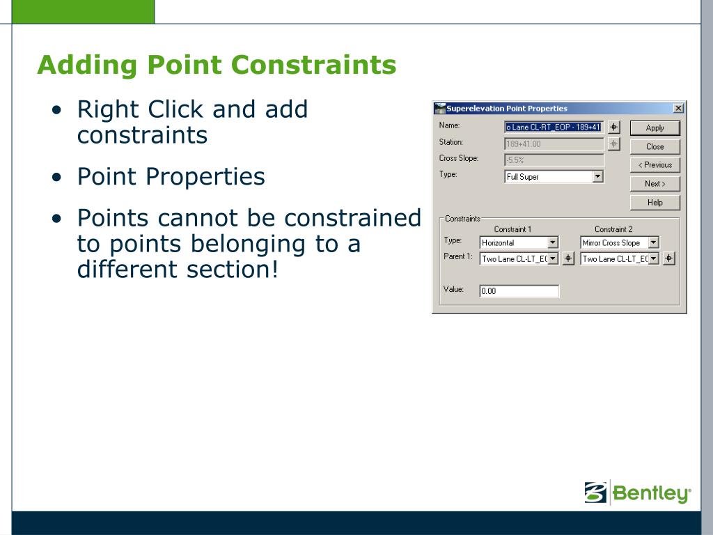 Adding Point Constraints • Right Click and add constraints • Point Properties • Points cannot be constrained to points belonging to a different section!