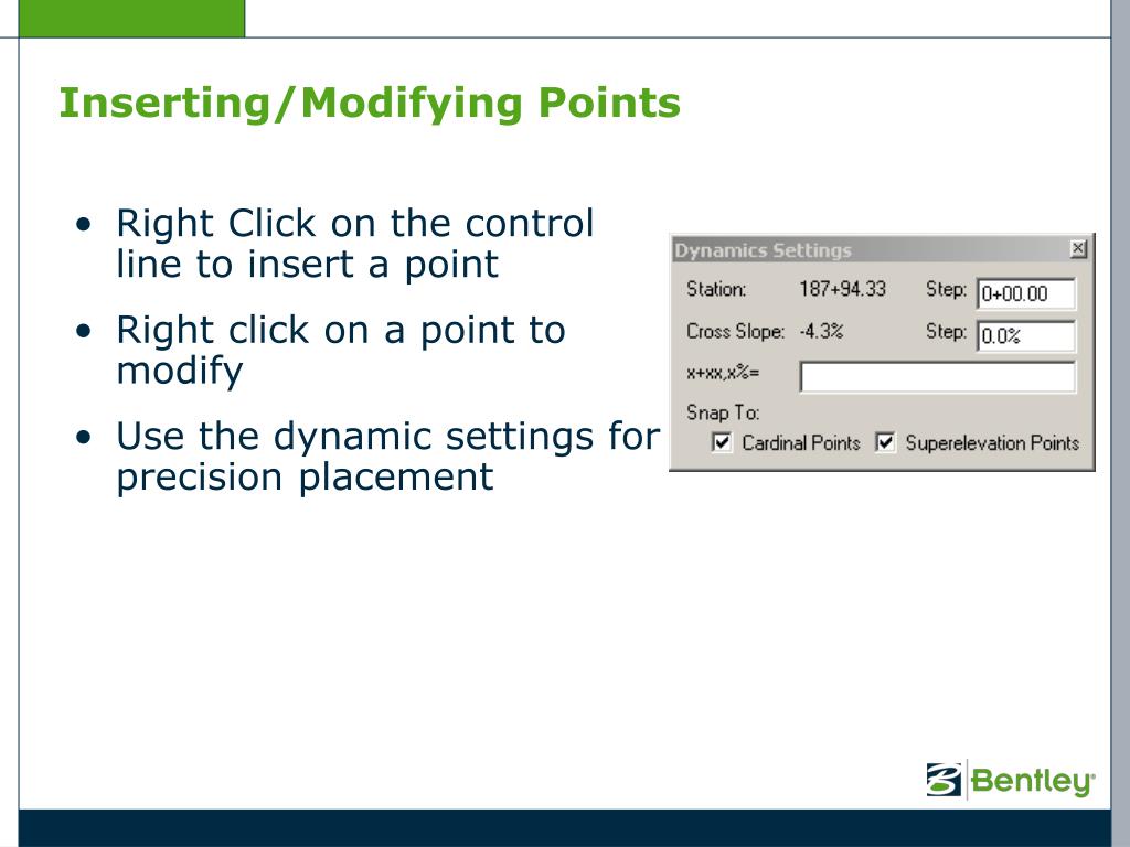 Inserting/Modifying Points • Right Click on the control line to insert a point • Right click on a point to modify • Use the dynamic settings for precision placement