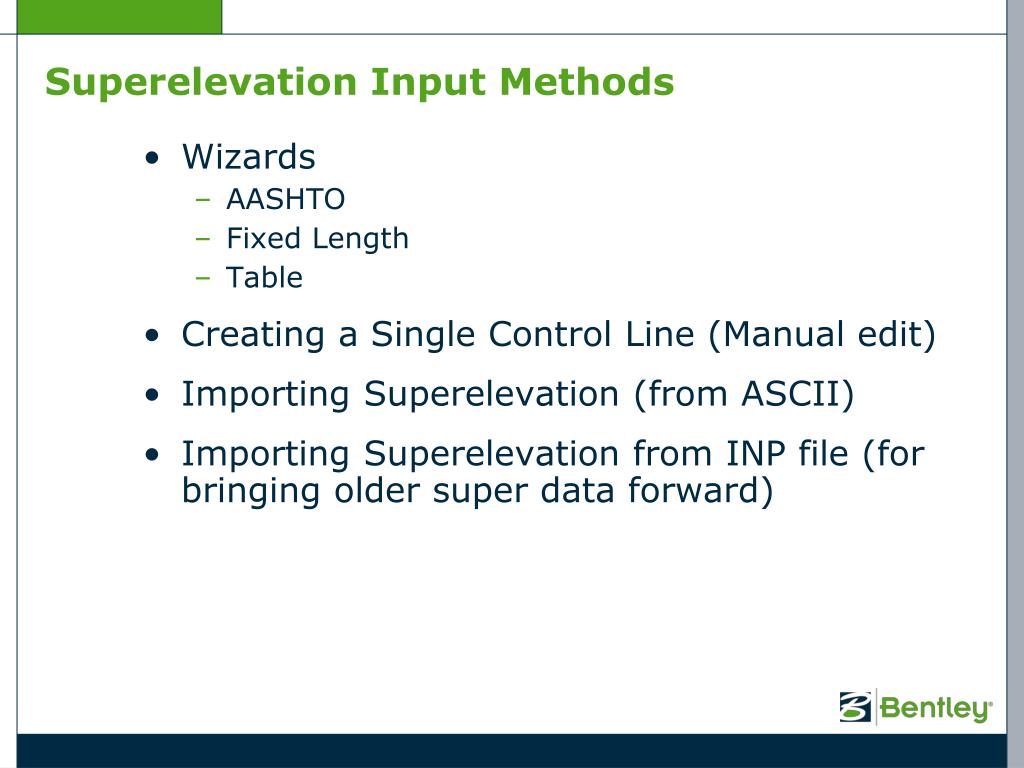 Superelevation Input Methods • Wizards • AASHTO • Fixed Length • Table • Creating a Single Control Line (Manual edit) • Importing Superelevation (from ASCII) • Importing Superelevation from INP file (for bringing older super data forward)