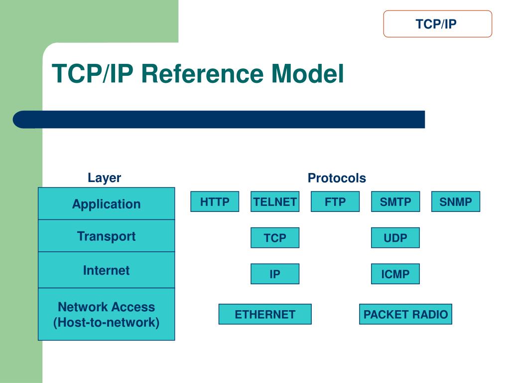 Layer Application Transport Internet Network Access(Host-to-network) TCP/IP TCP/IP Reference Model Protocols HTTP TELNET FTP SMTP SNMP TCP UDP IP ICMP ETHERNET PACKET RADIO