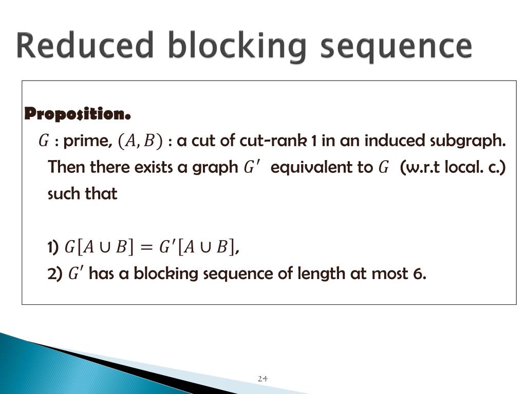 Reduced blocking sequence Proposition. : prime, : a cut of cut-rank 1 in an induced subgraph. Then there exists a graph equivalent to (w.r.t local. c.) such that 1) , 2) has a blocking sequence of length at most 6. 24