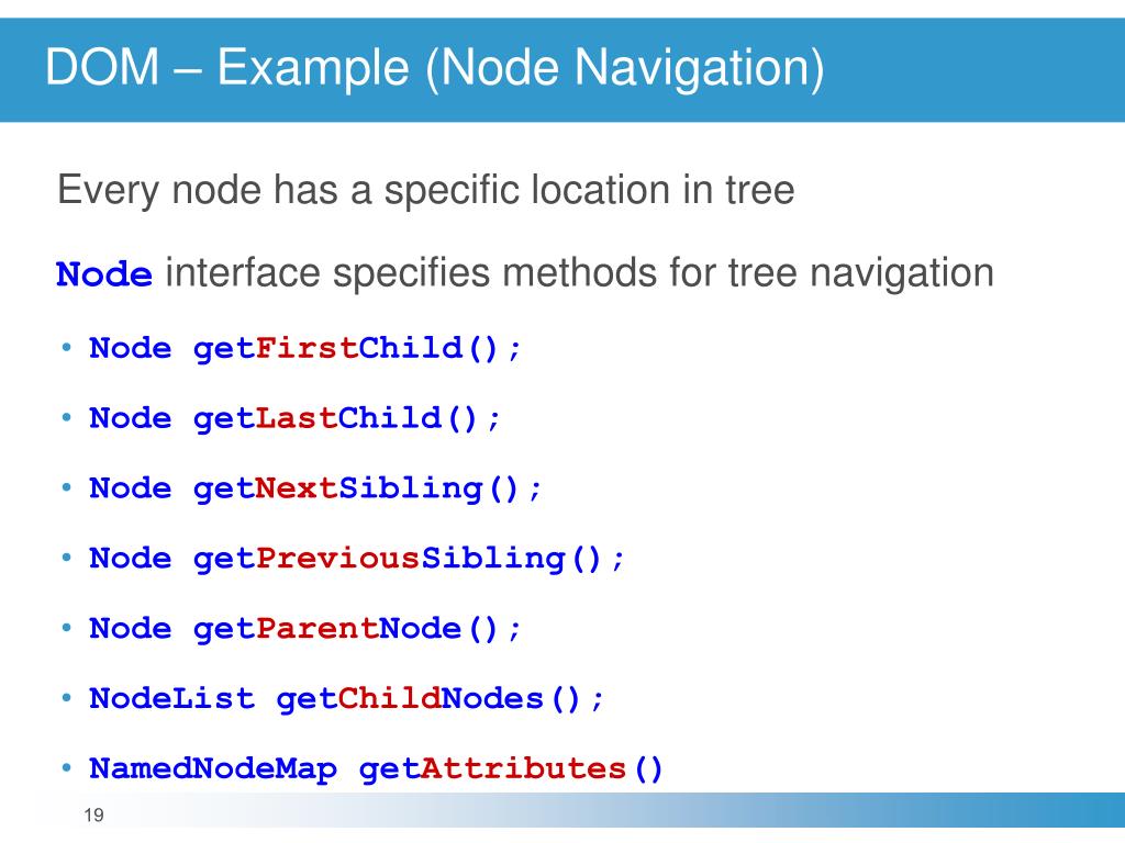 DOM – Example (Node Navigation) • Every node has a specific location in tree • Node interface specifies methods for tree navigation • Node getFirstChild(); • Node getLastChild(); • Node getNextSibling(); • Node getPreviousSibling(); • Node getParentNode(); • NodeListgetChildNodes(); • NamedNodeMapgetAttributes()