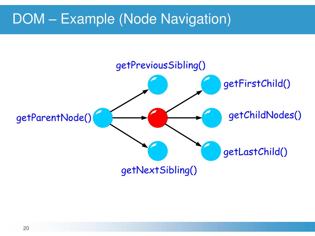 DOM – Example (Node Navigation) getPreviousSibling() getFirstChild() getChildNodes() getParentNode() getLastChild() getNextSibling()