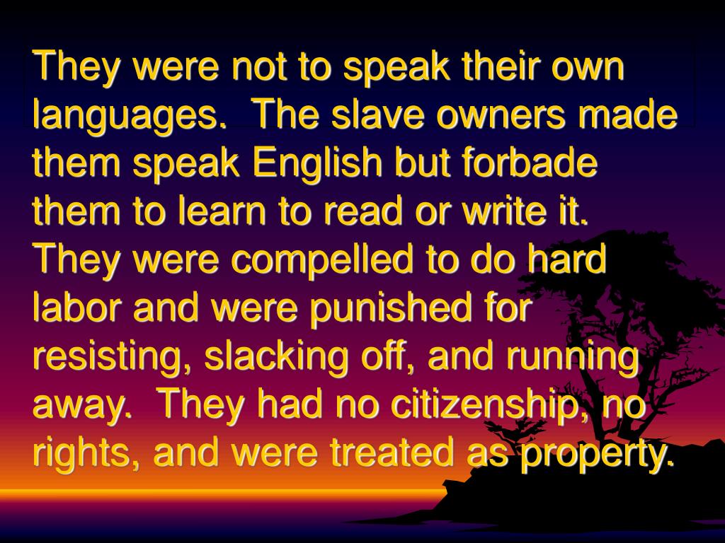 They were not to speak their own languages. The slave owners made them speak English but forbade them to learn to read or write it. They were compelled to do hard labor and were punished for resisting, slacking off, and running away. They had no citizenship, no rights, and were treated as property.