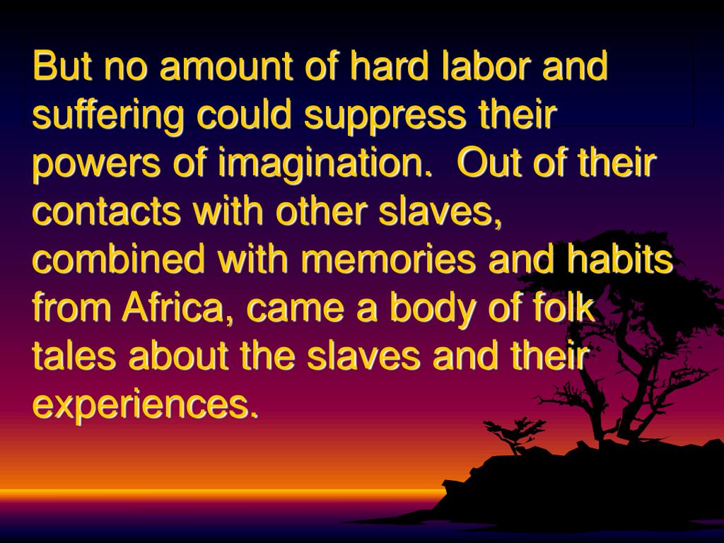 But no amount of hard labor and suffering could suppress their powers of imagination. Out of their contacts with other slaves, combined with memories and habits from Africa, came a body of folk tales about the slaves and their experiences.