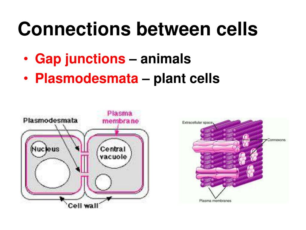 Connections between cells Gap junctions – animals Plasmodesmata – plant cells