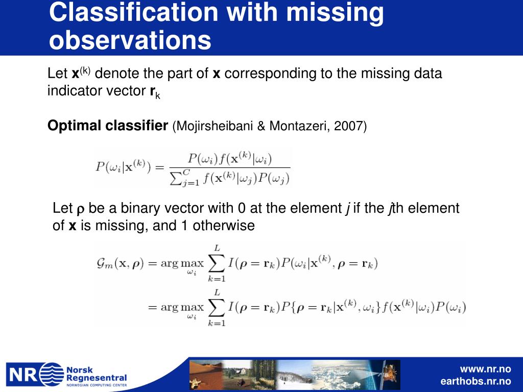 Classification with missing observations Let x(k) denote the part of x corresponding to the missing data indicator vector rk Optimal classifier (Mojirsheibani & Montazeri, 2007) Let r be a binary vector with 0 at the element j if the jth element of x is missing, and 1 otherwise