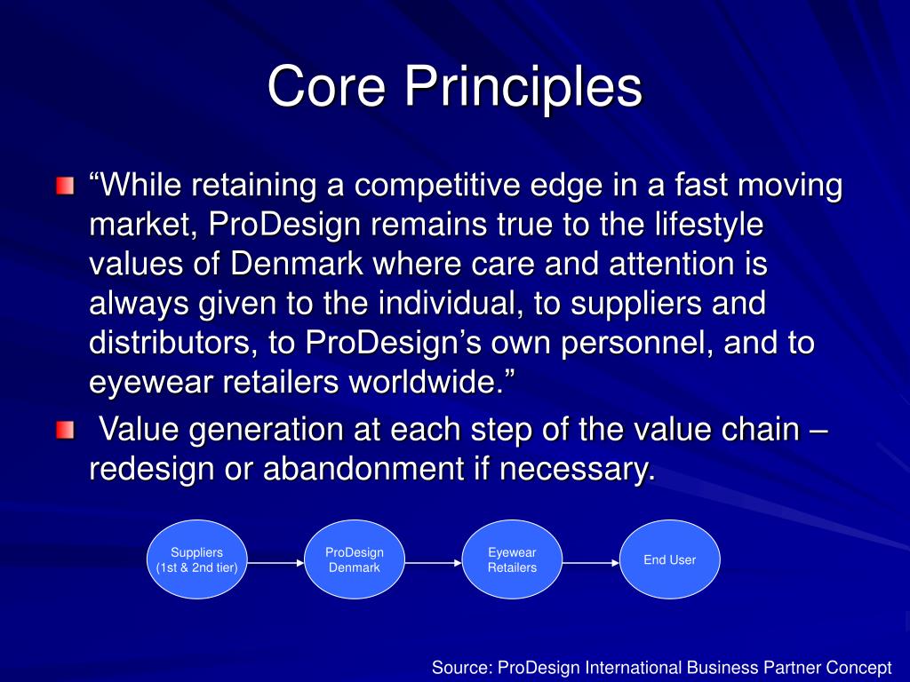 Core Principles • “While retaining a competitive edge in a fast moving market, ProDesign remains true to the lifestyle values of Denmark where care and attention is always given to the individual, to suppliers and distributors, to ProDesign’s own personnel, and to eyewear retailers worldwide.” • Value generation at each step of the value chain – redesign or abandonment if necessary. Suppliers (1st & 2nd tier) ProDesign Denmark Eyewear Retailers End User Source: ProDesign International Business Partner Concept