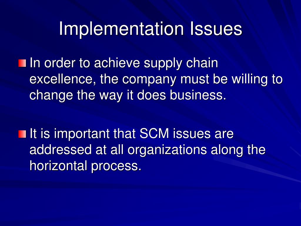 Implementation Issues • In order to achieve supply chain excellence, the company must be willing to change the way it does business. • It is important that SCM issues are addressed at all organizations along the horizontal process.