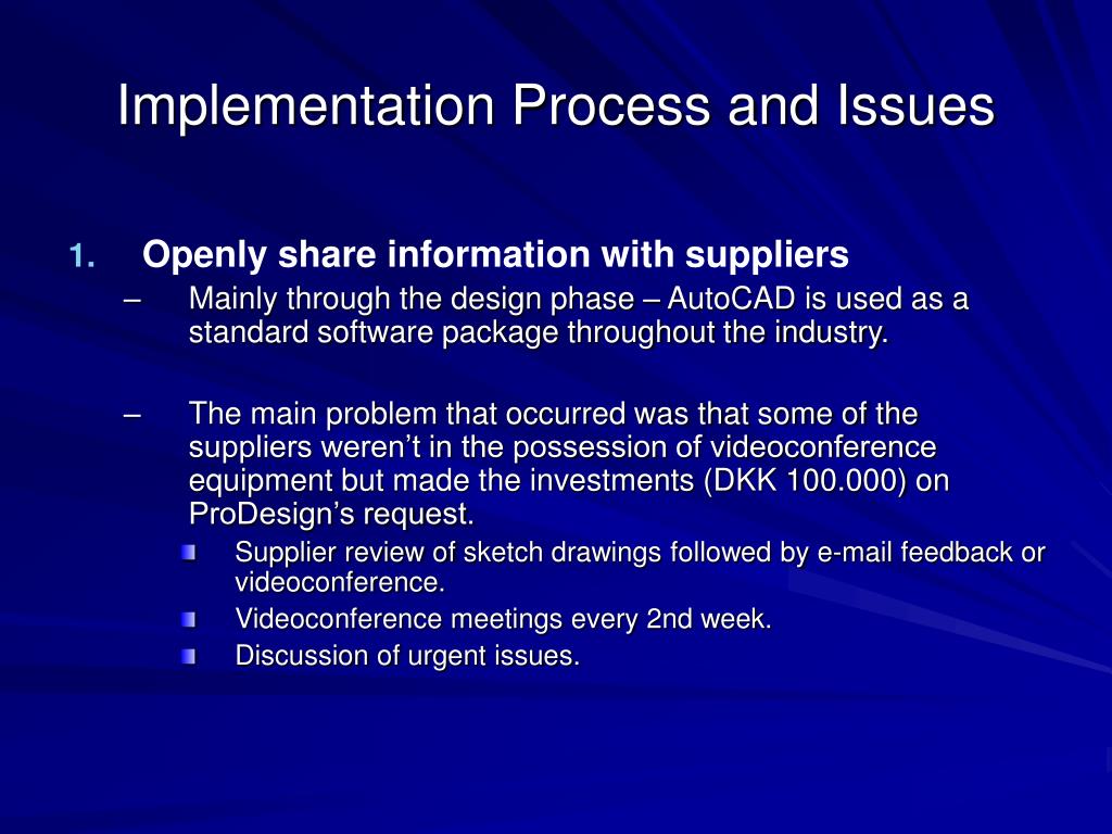 Implementation Process and Issues • Openly share information with suppliers • Mainly through the design phase – AutoCAD is used as a standard software package throughout the industry. • The main problem that occurred was that some of the suppliers weren’t in the possession of videoconference equipment but made the investments (DKK 100.000) on ProDesign’s request. • Supplier review of sketch drawings followed by e-mail feedback or videoconference. • Videoconference meetings every 2nd week. • Discussion of urgent issues.
