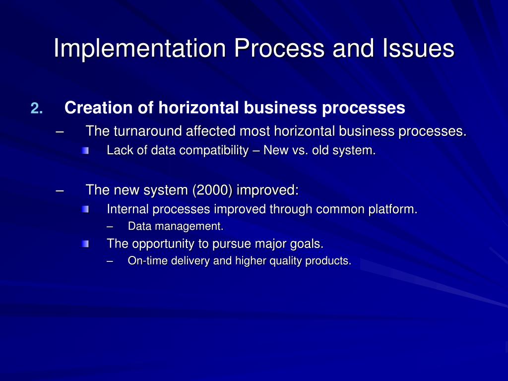 Implementation Process and Issues • Creation of horizontal business processes • The turnaround affected most horizontal business processes. • Lack of data compatibility – New vs. old system. • The new system (2000) improved: • Internal processes improved through common platform. • Data management. • The opportunity to pursue major goals. • On-time delivery and higher quality products.