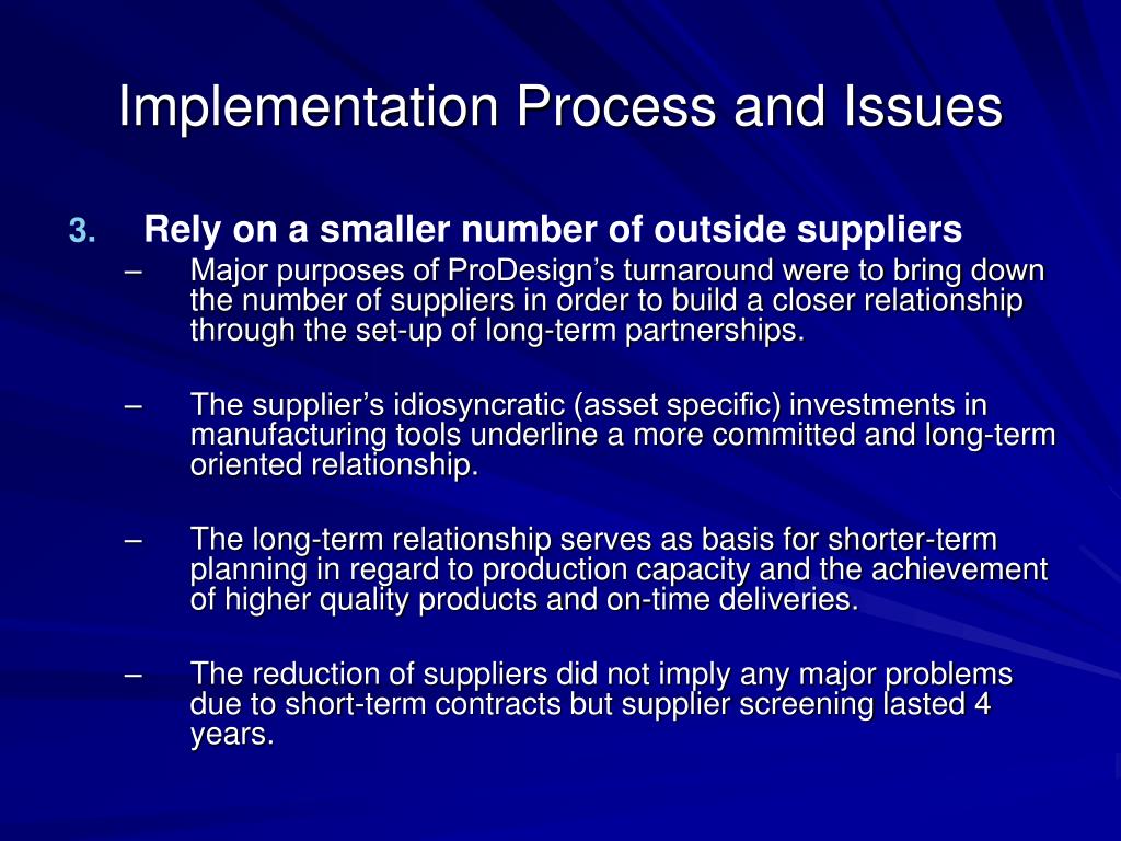 Implementation Process and Issues • Rely on a smaller number of outside suppliers • Major purposes of ProDesign’s turnaround were to bring down the number of suppliers in order to build a closer relationship through the set-up of long-term partnerships. • The supplier’s idiosyncratic (asset specific) investments in manufacturing tools underline a more committed and long-term oriented relationship. • The long-term relationship serves as basis for shorter-term planning in regard to production capacity and the achievement of higher quality products and on-time deliveries. • The reduction of suppliers did not imply any major problems due to short-term contracts but supplier screening lasted 4 years.