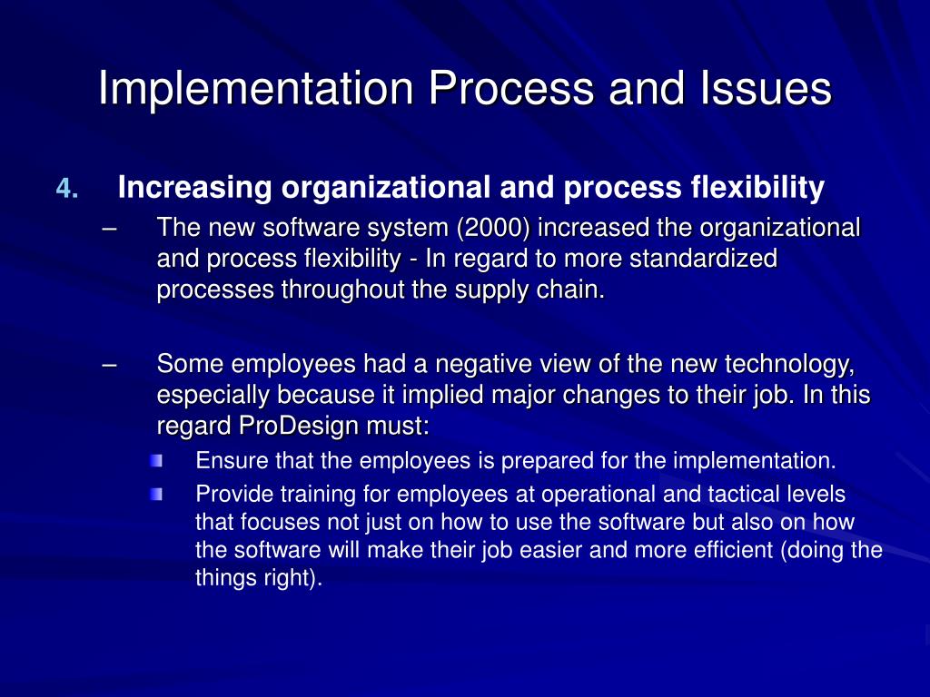 Implementation Process and Issues • Increasing organizational and process flexibility • The new software system (2000) increased the organizational and process flexibility - In regard to more standardized processes throughout the supply chain. • Some employees had a negative view of the new technology, especially because it implied major changes to their job. In this regard ProDesign must: • Ensure that the employees is prepared for the implementation. • Provide training for employees at operational and tactical levels that focuses not just on how to use the software but also on how the software will make their job easier and more efficient (doing the things right).