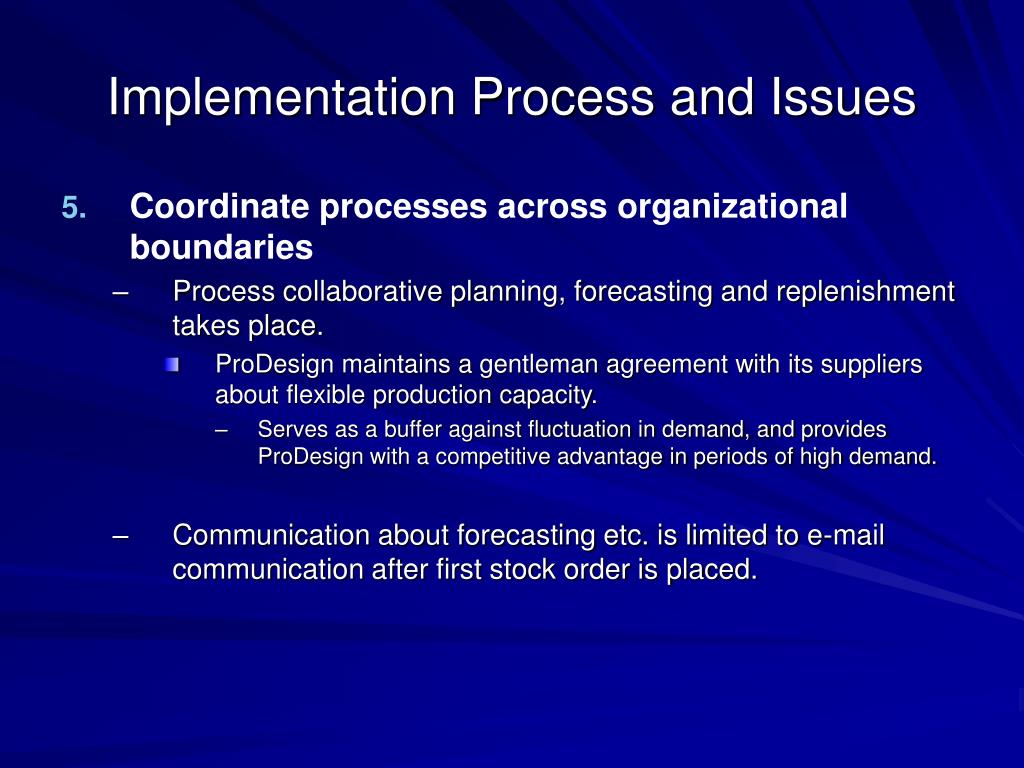 Implementation Process and Issues • Coordinate processes across organizational boundaries • Process collaborative planning, forecasting and replenishment takes place. • ProDesign maintains a gentleman agreement with its suppliers about flexible production capacity. • Serves as a buffer against fluctuation in demand, and provides ProDesign with a competitive advantage in periods of high demand. • Communication about forecasting etc. is limited to e-mail communication after first stock order is placed.