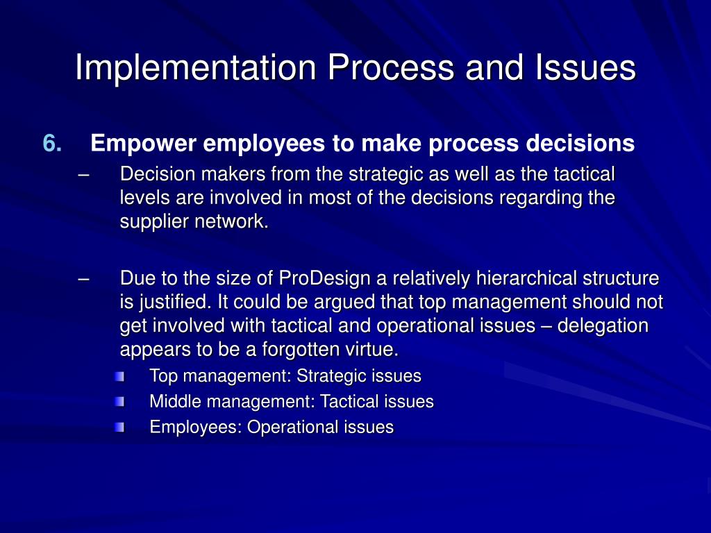 Implementation Process and Issues • Empower employees to make process decisions • Decision makers from the strategic as well as the tactical levels are involved in most of the decisions regarding the supplier network. • Due to the size of ProDesign a relatively hierarchical structure is justified. It could be argued that top management should not get involved with tactical and operational issues – delegation appears to be a forgotten virtue. • Top management: Strategic issues • Middle management: Tactical issues • Employees: Operational issues
