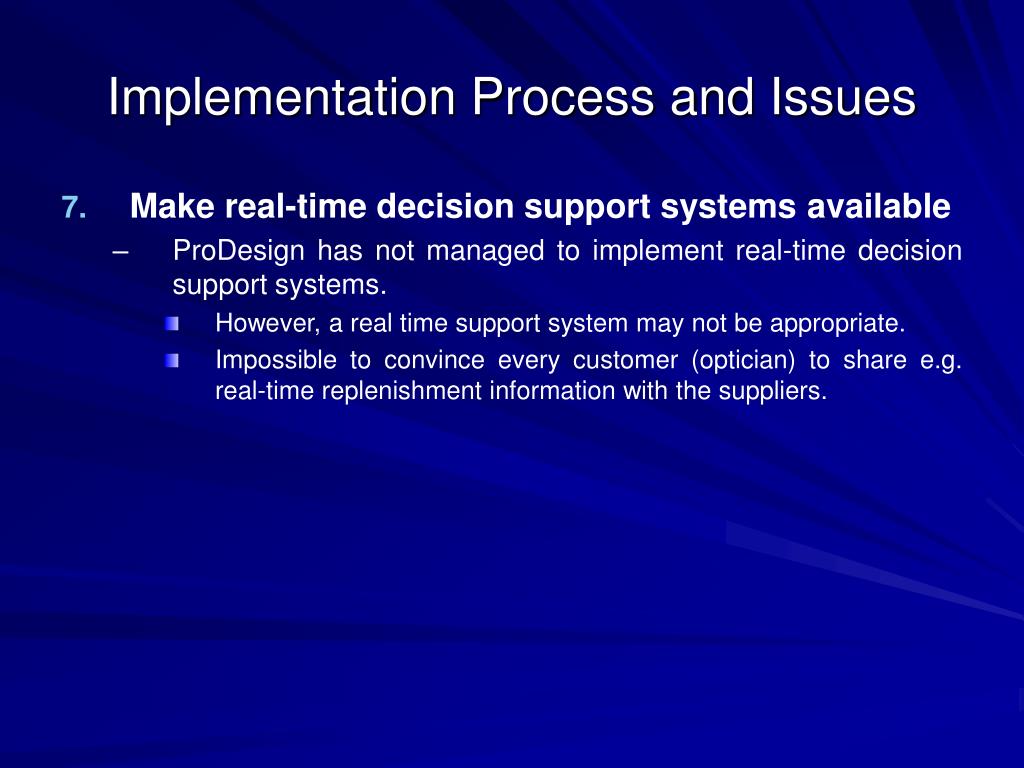 Implementation Process and Issues • Make real-time decision support systems available • ProDesign has not managed to implement real-time decision support systems. • However, a real time support system may not be appropriate. • Impossible to convince every customer (optician) to share e.g. real-time replenishment information with the suppliers.