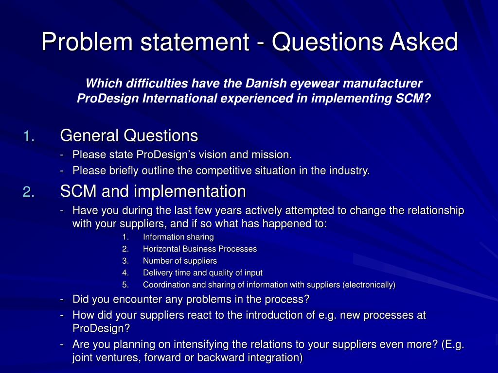 Which difficulties have the Danish eyewear manufacturer ProDesign International experienced in implementing SCM? Problem statement - Questions Asked General Questions - Please state ProDesign’s vision and mission. - Please briefly outline the competitive situation in the industry. SCM and implementation - Have you during the last few years actively attempted to change the relationship with your suppliers, and if so what has happened to: Information sharing Horizontal Business Processes Number of suppliers Delivery time and quality of input Coordination and sharing of information with suppliers (electronically) - Did you encounter any problems in the process? - How did your suppliers react to the introduction of e.g. new processes at ProDesign? - Are you planning on intensifying the relations to your suppliers even more? (E.g. joint ventures, forward or backward integration)