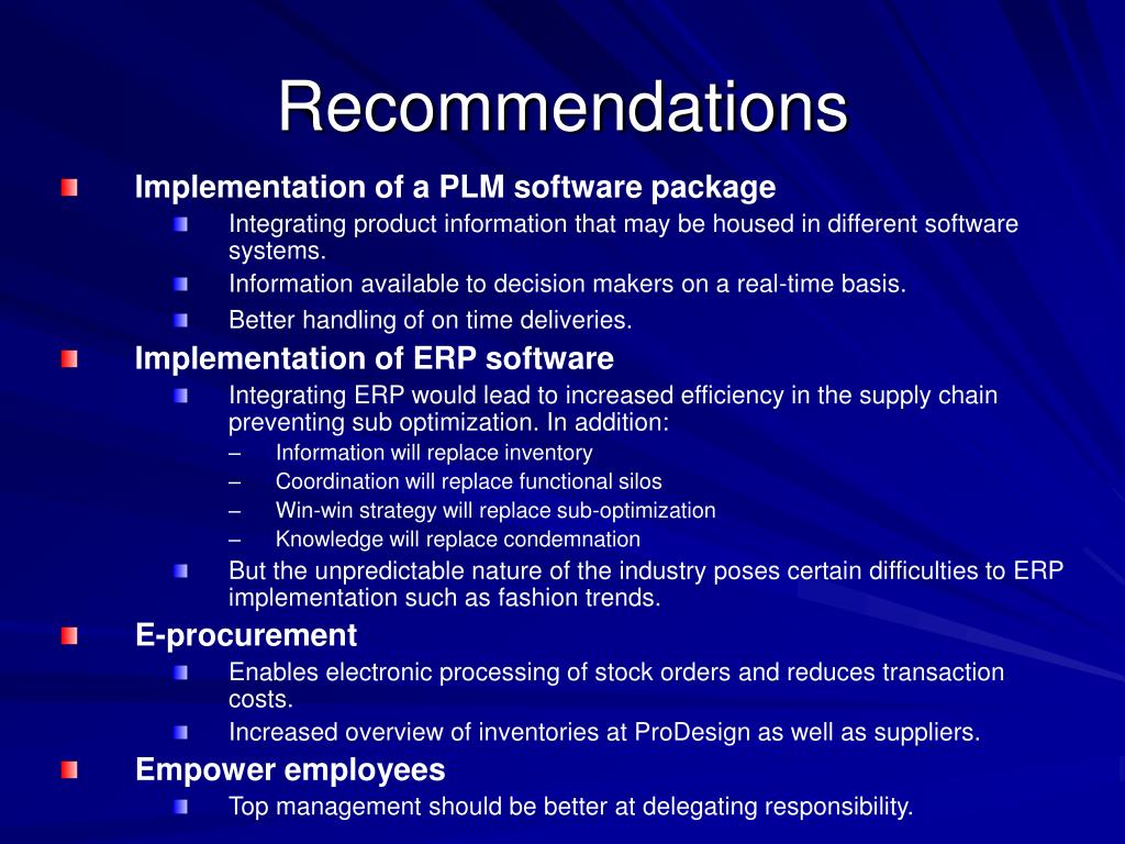 Recommendations • Implementation of a PLM software package • Integrating product information that may be housed in different software systems. • Information available to decision makers on a real-time basis. • Better handling of on time deliveries. • Implementation of ERP software • Integrating ERP would lead to increased efficiency in the supply chain preventing sub optimization. In addition: • Information will replace inventory • Coordination will replace functional silos • Win-win strategy will replace sub-optimization • Knowledge will replace condemnation • But the unpredictable nature of the industry poses certain difficulties to ERP implementation such as fashion trends. • E-procurement • Enables electronic processing of stock orders and reduces transaction costs. • Increased overview of inventories at ProDesign as well as suppliers. • Empower employees • Top management should be better at delegating responsibility.
